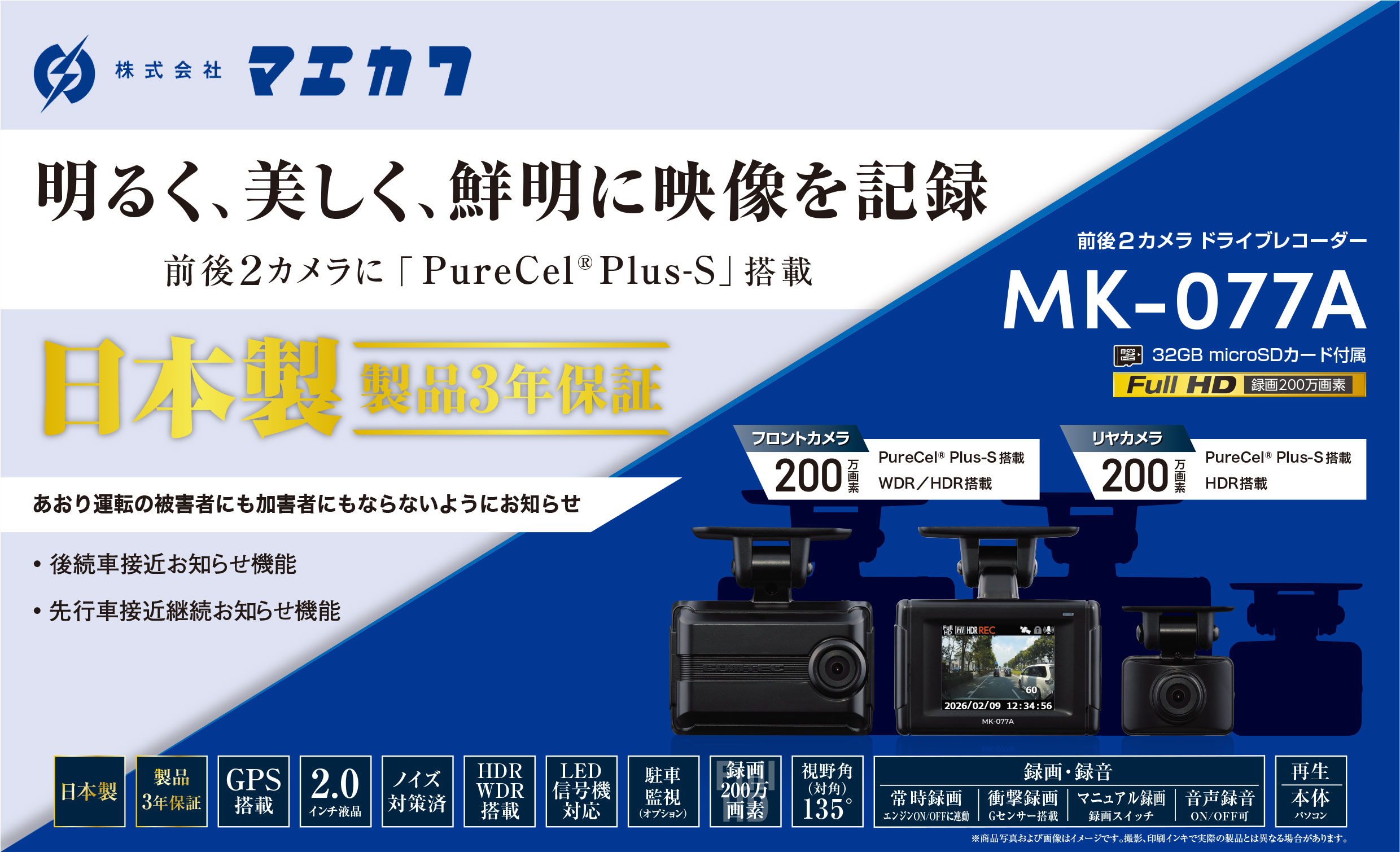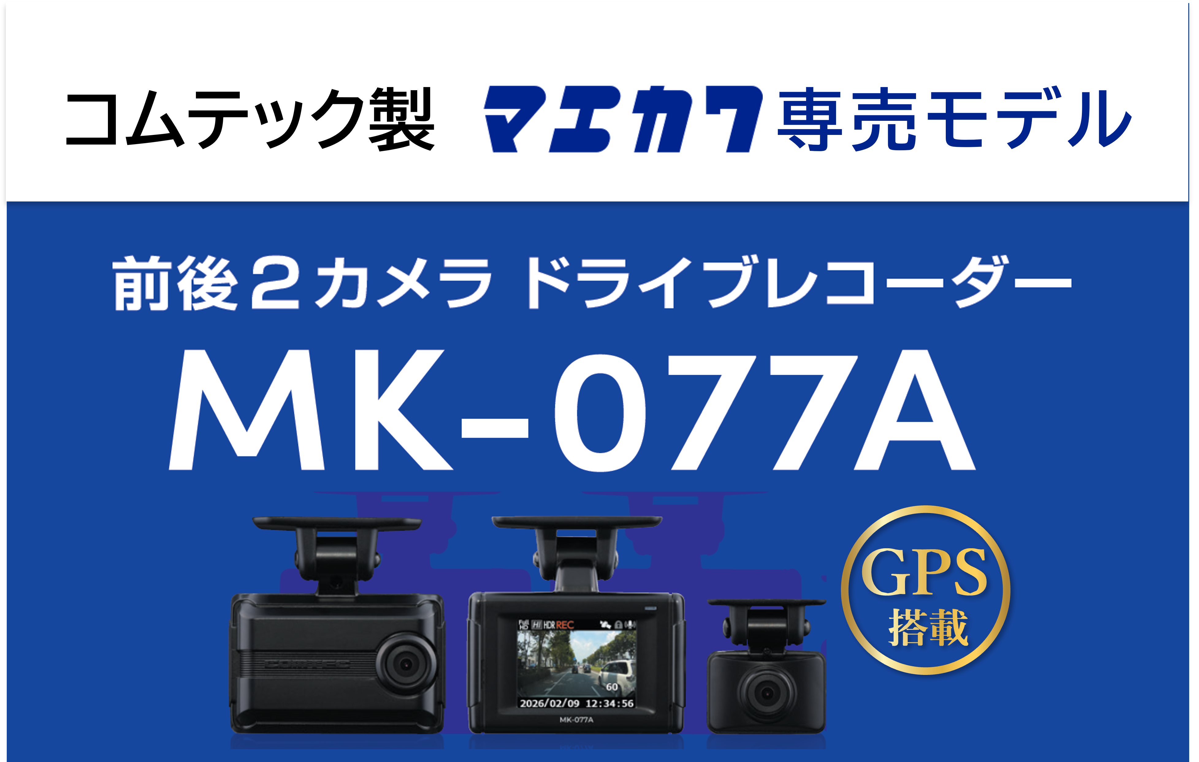 株式会社マエカワは、株式会社コムテック様より当社専売モデルとしてご提供いただいた、前後2カメラドライブレコーダー「MK-077A」を2026年1月末に発売いたします。創業77周年を迎えた節目に合わせ、モデル名には「77」を、そしてAnniversary(アニバーサリー) を象徴する「A」を冠しました。日頃お客様からいただくご要望やニーズを取り入れて企画し、高画質録画や運転・駐車を支える便利な機能を備えた、使いやすさを大切に仕上げたモデルです。
