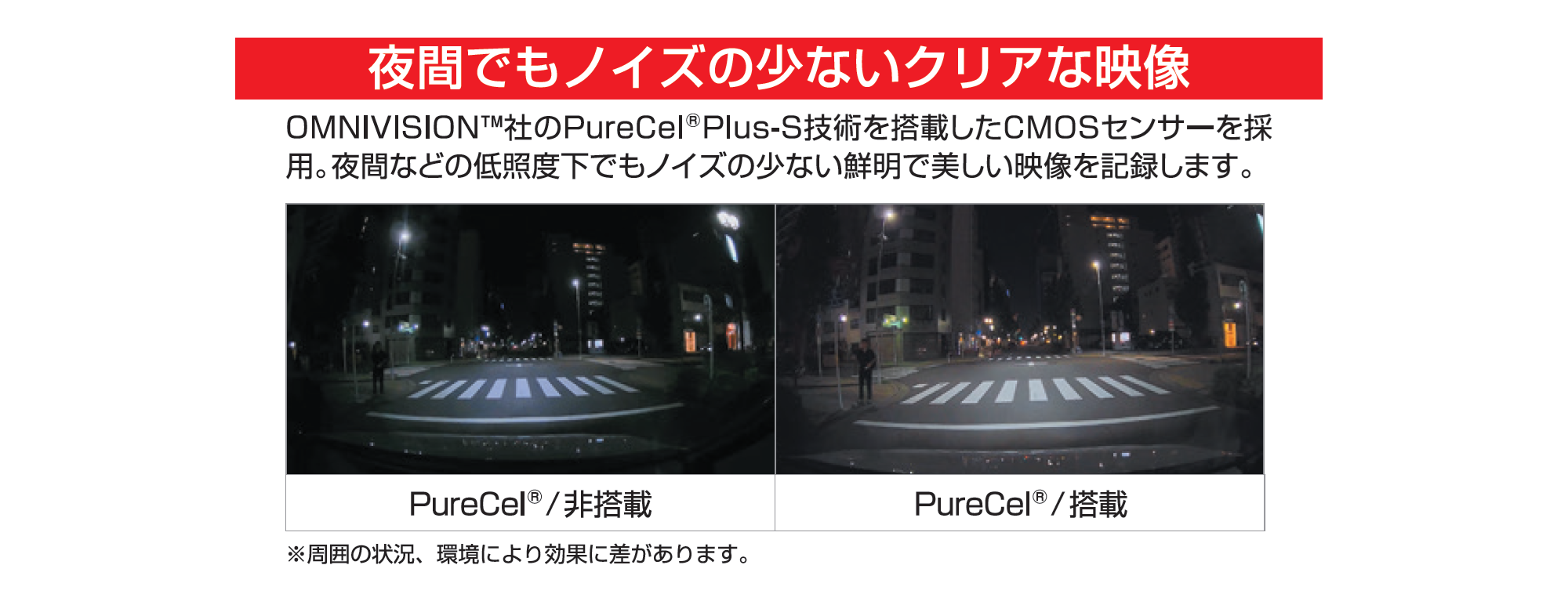前後200万画素のFull HD録画に対応し、高感度センサー「PureCel® Plus-S」を搭載。夜間や逆光などの環境でも鮮明な映像を記録できます。LED信号機の無点灯を防ぐ対策やHDRによる白とび・黒つぶれの軽減など、日常の走行に必要な画質性能を備えています。